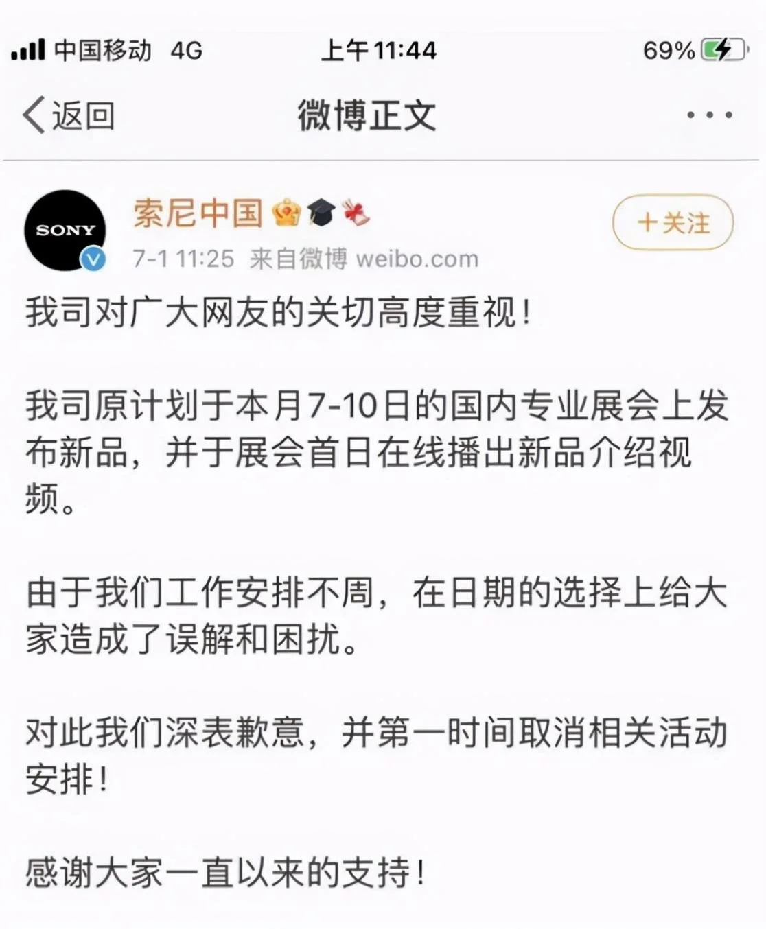 7月1日上午,索尼中国对此事发布微博,称公司原计划于本月7月7日至10日的国内专业展会上发布新品,并于展会首日在线播出新品介绍视频。但由于工作安排不周,在日期的选择上给公众造成误解和困扰,对此深表歉意,并取消相关活动安排。