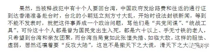台湾当局不是整天宣传他们的经济繁荣,政治民主、军事强大吗?为什么不利用这个黄金的机会让这些人回来看看,再把他们送回大陆去为国民党作“统战”呢?但是,想不到台湾当局听到他们要来,竟吓得浑身哆嗦,使尽阴谋诡计去刁难他们,折磨他们,侮辱他们。 国民党的政工干校这几十年训练出不少“心战专家”,他们不可能都是窝囊废,他们为这件事必辗转地权衡利害,搜尽枯肠;但结果还是怕。倘若这十个人到达台湾 他们怕什么呢?他们怕这十个人一旦到了台湾,不论是否说话,甚至骂大陆一通,蒋家的小朝廷都受不了,因为这十个人自由走出大陆的本身,就足以证明新中国的强大、宽大,就足以粉碎那些“心战专家”二十多年来的“恐共”宣传所造成的心理防线。