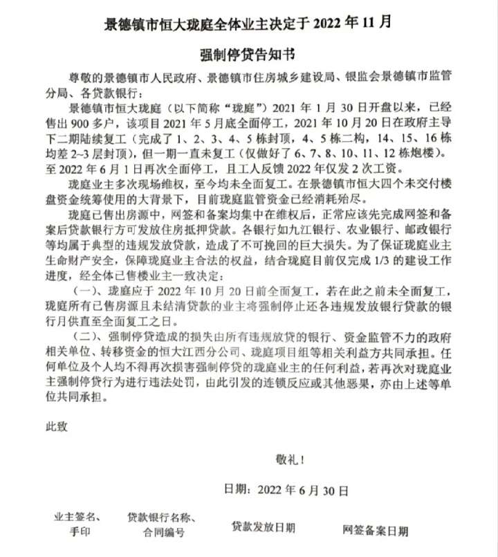 如何看待『景德镇市恒大珑庭全体业主决定于2022年11月强制停贷告知书』? 冲上热搜。