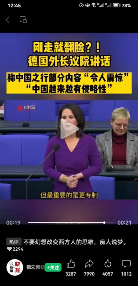 普雷西特说贝尔伯克视中国为体制对手,问题是中国人根本就没有输出自己的体制,中国人没有传教的习惯、说我们的体制多么、多么地好,全世界都得跟我们学。那么,是谁愿意传教呢?是异神教的宗教:基督教和伊斯兰。中国人说“你们走你们的路,我们有自己的选择”。可是我们(指西方国家——笔者注)不答应,这是我们该反思的!为什么我们不能说让中国人走自己的路,这是他们自己的事情,中国人有选择自己道路的权利?主持人问:当你看到贝尔伯克在中国访问画面的时候,你心里是怎么想的?普雷希特反问:想听我的心里话吗?他说,这个女人当外交部长完全是一场事故,在正常条件下,他连去外交部实习的机会都没有。她用一种班级代表的道德狂热来向一个文化大国解释西方的价值,称对方是体制对手,把以冲突为主导的外交包装成价值观外交。这位40出头、迄今没有任何建树的女人,竟然在联合国威胁中国——这个让6亿人脱贫实、现了人类有史以来最高速经济发展的国家,作为德国人,我恨不得找个地方钻进去。中国是个崇尚智者的国家,在这样一个国家面前,你一个楞头青,拿不出治理国家的任何政绩,你甚至拿不出任何值得一提的成就。不仅如此,你还美化自己的简历,让别人替你写书,这样的一个人竟然威胁中国,中国人会怎么想?在普雷西特看来,德国应当踏踏实实发展经济,经济保持强大,中国就会把你当回事。假如一味寻求对抗,甚至与中国脱钩,那么,德国经济将大踏步走向衰败。这位哲学家说,到那时候,你的价值观就更让人看不上了。