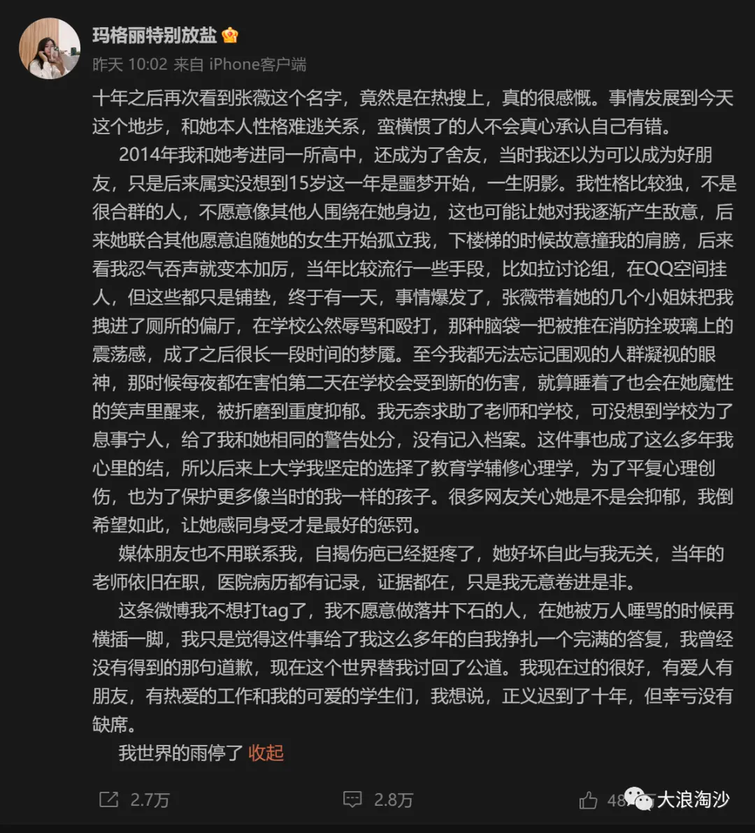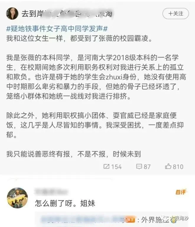 这件事情我一直在写着,但无奈各种信息更新太快,比如昨天刚刚爆出来,张薇早年是校园霸凌作恶者,受害者当时几乎自杀,多年才走出来: