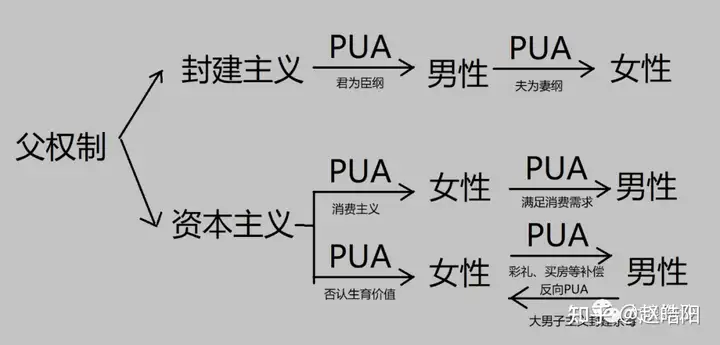 我在《封建田园“男拳”VS自由主义“女拳”》这一篇文章中画了一张图,我认为总结得非常精炼了(自吹自擂),两性矛盾的根源就是父权制转嫁的矛盾——
