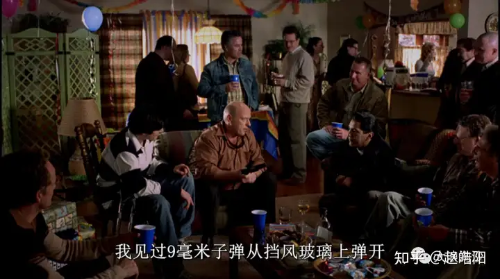 在家庭生活中,汉克对于老白的气质压制是全方面的。在老白五十岁生日会上,汉克自然而然地成为了全场瞩目的焦点,讲述着他缉毒过程中遇到的种种惊险与趣闻。而本应该是party主角的寿星老白,却在一旁被边缘化了——热闹是汉克的,老白什么都没有。