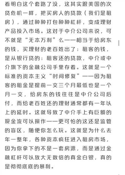 我在《疯涨的房租、超长通勤时间——大都市中的“边缘白领”与“资本游民”》这篇文章中分析过“房地产+金融”更深层次的套路,这个本来是付费内容,这里简单截两张图给大家感受一下: