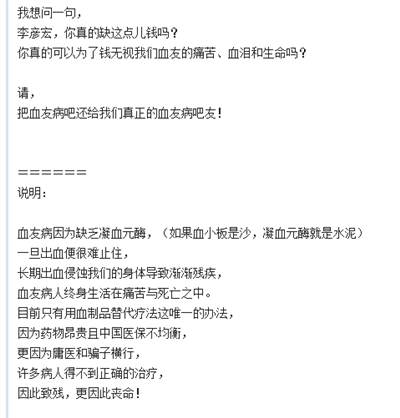 下文是血友病吧吧主@蚂蚁菜 的声明: