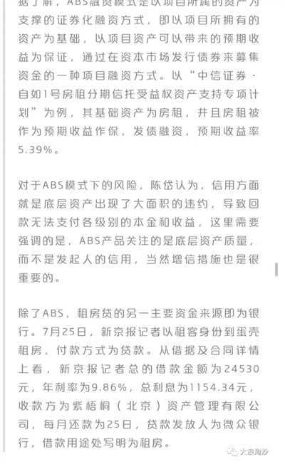先看一种操作,叫“房租证券化”,这个在三年前蛋壳公寓爆雷后,大家都比较好理解了。蛋壳公寓鼓励租户借贷交房租,甚至通过借贷的方式,把本来租房的押一付三变成了一次一年——这样租户看似是月付,分摊了成本,但是原本的房租就变成了借贷还款;原本跟二房东的租赁合同,变成了跟银行的贷款合同。这样巧妙的变化欺骗了不少年轻人,也是这次暴雷后许多年轻人进退失据的根源。