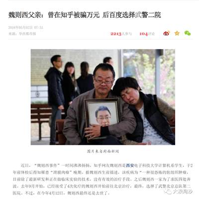 在与网友交流的帖子中,魏则西写道:“(在百度上搜索)在上面第一条就是某武警医院的生物免疫疗法,我爸妈当时就和这家医院联系,见到了他们一个姓李的主任,他的原话是这么说的,这个技术是斯坦福研发出来的,有效率达到百分之八九十,还给我爸妈说保我二十年没问题,我们还专门查了一下这个医生,他还上过中央台,CCTV10,不止一次,当时想着,百度,三甲医院,中央台,斯坦福的技术,这些应该没有问题了吧。”