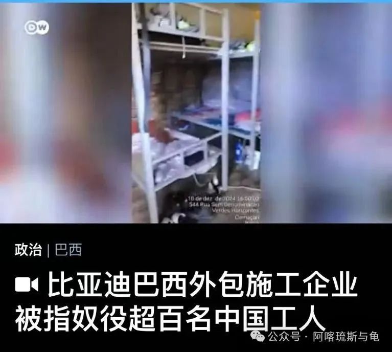 话说163名中国建筑工人,远渡重洋去巴西,建设比亚迪的第一座海外工厂。结果被当地的劳动部门发现,这些伟大的工人阶级,居然住工棚,生活条件极端恶劣,三十多个人共用一个卫生间,睡觉的床没有被褥,而且每天凌晨4点鸡都还没叫,就得起床排队洗漱,一周得连续工作七天。等等!