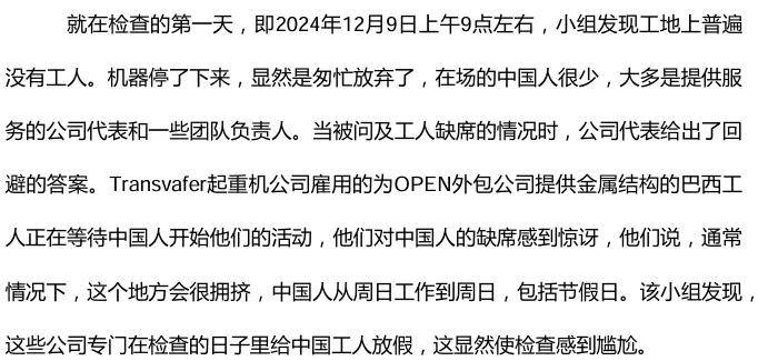所以,起诉书提供了一个耐人寻味的细节,当巴西公共劳动部到工地检查时,本该繁忙的工地却意外地给中国工人放假: