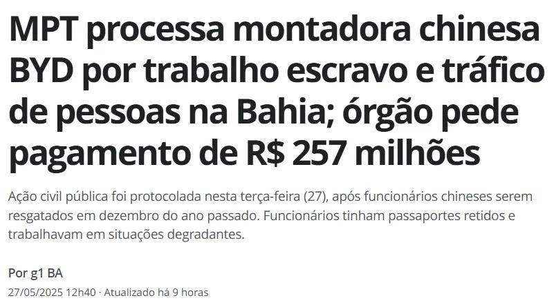 2025年5月27日,巴西联邦劳动检察院正式对比亚迪及其两家合作建筑公司——中国金匠建筑巴西有限公司和巴西同和智能装备公司(江苏同和智能装备有限公司的巴西分公司)提起诉讼,要求比亚迪为220名受奴役的中国劳工支付总计2.57亿巴西雷亚尔(约合3.24亿人民币)的集体精神损害赔偿金,并赔偿其他违反巴西劳动法的行为。