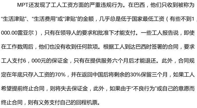 涉事的两家外包公司之一的金匠公司除了雇佣163名中国工人,还雇佣了470名巴西当地工人,但MPT在收到举报后的检查中,并未发现中国企业这样对待巴西工人(居住条件恶劣、超长工时等)。