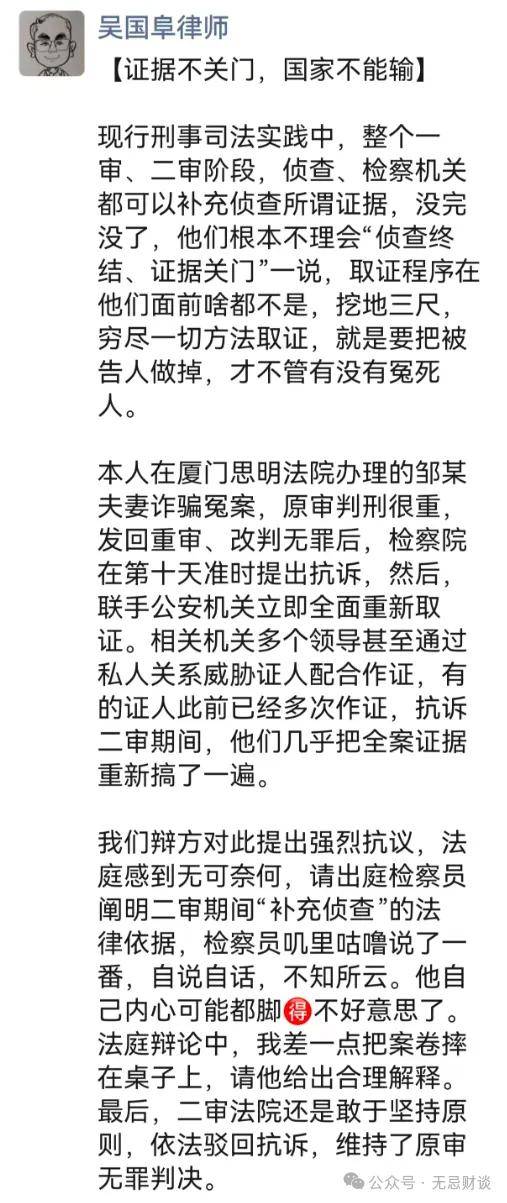 知名刑辩律师吴国阜说,现在刑案的司法实践中,一审、二审阶段,侦查、检察机关都可以补充侦查所谓证据,没完没了,他们根本不理会“侦查终结、证据关门”一说,取证程序在他们面前啥都不是,挖地三尺穷尽一切方法取证,就是要把被告人做掉,才不管有没有冤死人。
