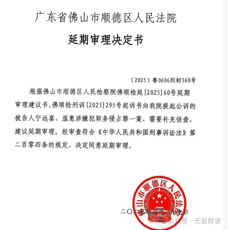 12月8日下午,宁远喜、温惠的辩护律师接到顺德法院通知:“因需补充侦查,顺德检察院向法院提出延期审理建议,经审查符合《刑诉法》第二百零四条的规定,法院决定同意延期审理。”
