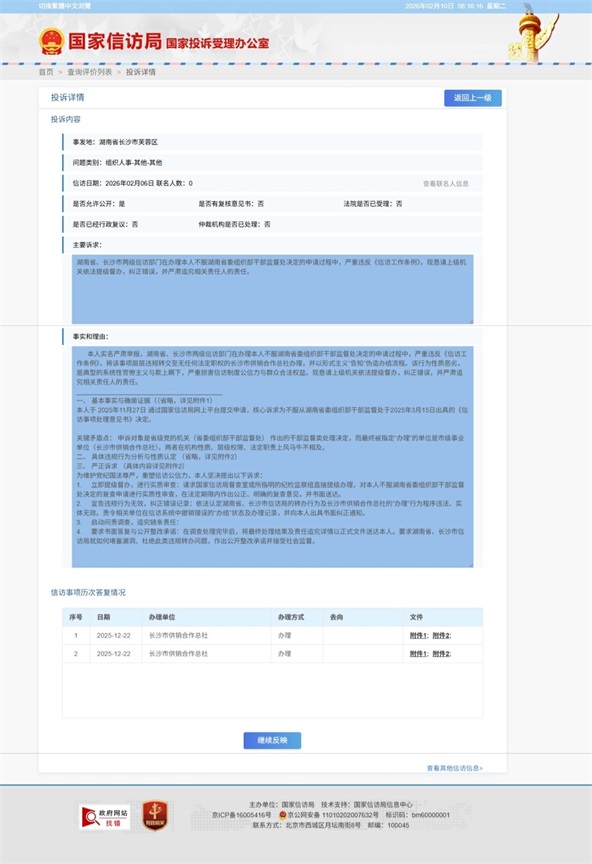 第一张截图显示,信访人提交诉求,核心是不服湖南省委组织部干部监督处出具的相关决定。然而,这一指向省级党组织干部监督事项的申诉,在层层流转后,最终却由长沙市供销合作总社 “办理” 并直接 “办结”。第二张截图,则是信访人针对这一明显违反《信访工作条例》的 “违规转办” 再次投诉,恳请提级督办,并直指其为 “系统性官僚主义与欺上瞒下”,但本该由省级部门统筹督办的诉求,竟又被转回长沙市供销合作总社,更匪夷所思的是,该单位竟再次以 “已办理” 结案。这两张截图,构成了一个比小品更令人沉重、更值得反思的现实样本,完整展示了一个表面完美、实质荒谬的伪闭环:从国家信访平台到省、市信访部门,再到基层单位,每一步都有记录、有时限、有签章,流程上看似无可指摘、无懈可击。可这个 “闭环” 的核心价值何在?一桩涉及干部监督的严肃申诉,被层层转交给一个既无权限、也无职能、更无资格处理此事的市属单位,无异于把心脏手术的诉求,交给社区药店来 “办结”。这种操作,正是小品里 “假投诉、真解决” 双簧的现实翻版 —— 用一套严密的文本流转和程序记录,伪造出 “问题已处理” 的假象,完成系统内的 “程序闭环”,却让核心矛盾在职权错配的 “空转” 中原地踏步,甚至进一步激化群众不满、消耗群众信任。
