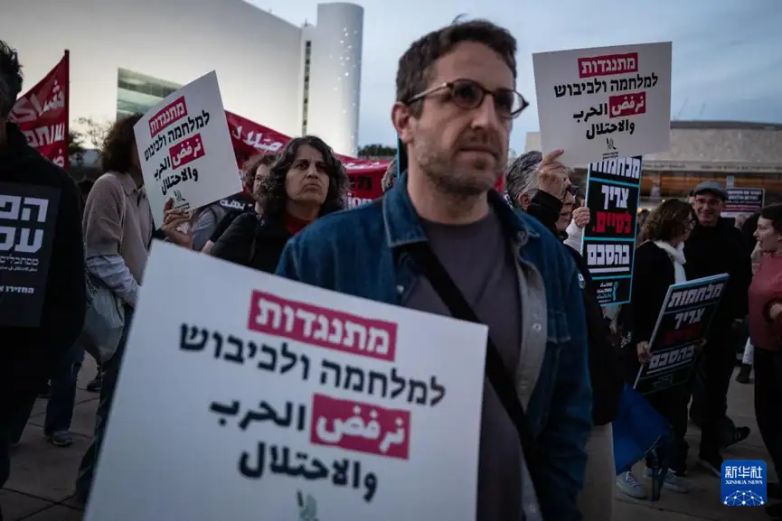 2026年3月28日,在以色列特拉维夫一处广场,人们手持标语参加反战集会。新华社记者 陈君清 摄