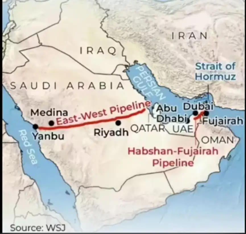 沙特的“东—西管道”(East–West Pipeline / Petroline)彻底绕开霍尔木兹海峡,这条管道的起点是沙特东部油田阿卜盖格(Abqaiq)附近,终点是红海沿岸的延布港(Yanbu),全长约1200公里,把原本必须经过霍尔木兹海峡的石油,直接输送到红海出海口。这条管道的设计能力约500万桶/日(bpd),实际可用(常态)约300–400万桶/日。