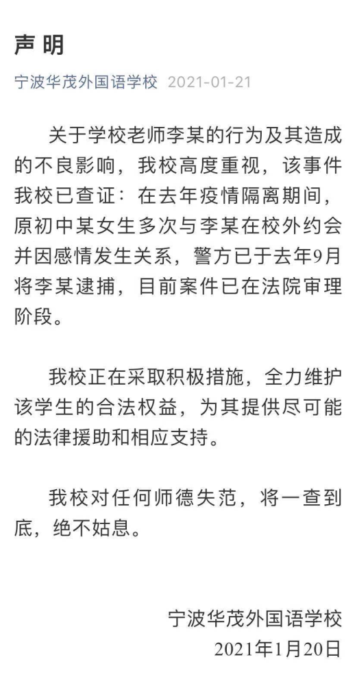 21日凌晨,宁波华茂外国语学校在其微信公众号上发表声明。