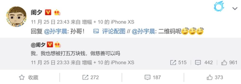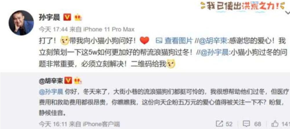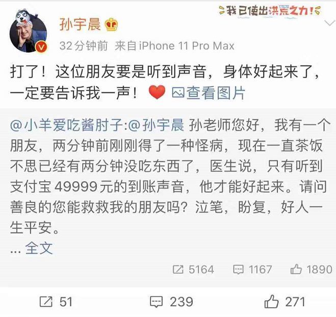 看起来是个不错的事情对吧?但孙宇晨一出现,这事情就不是那么简单,当这条微博刚刚发出来,就来了一些莫名其妙的大V、机构号,一个个喊着些莫名其妙的理由,要求孙宇晨打钱。比如:“孙老师,我得了一种听到五万块钱转账声音才能吃饭的病,求您打个钱给我救命”之类的。