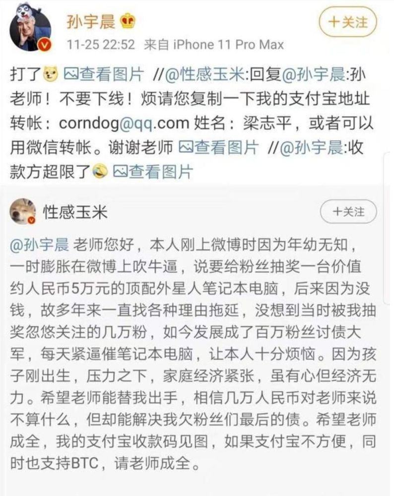 但是,大家请擦亮眼睛,注意观察,从一开始找孙宇晨要钱的互联网大V冯大辉和性感玉米,到最后所有收到钱的微博网友,他们每一个,几乎都是几十万粉丝、上百万粉丝的大V、自媒体人,跟着起哄讨钱叫爹的,大部分都是他们币圈的人士。你一个普通人,跑去问孙宇晨要钱?怎么可能呢,你又没有影响力,他需要的就是这些大V的传粉丝数和传播度。
