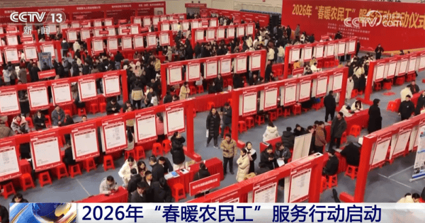 1月24日,在安徽省亳州市体育馆,求职者在2026年“春暖农民工”服务行动启动仪式专场招聘会上寻找适合自己的就业岗位。图源:央视新闻