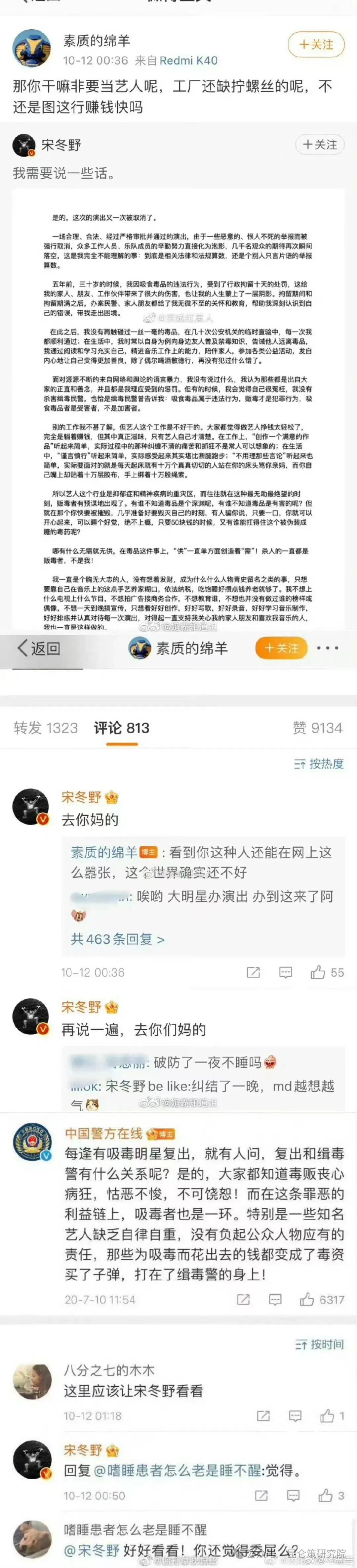 宋冬野事件正是这一撕裂的典型体现。在演出审批通过后经大众举报被取消时,他发微博多次辱骂网友。这种对公众质疑的敌视态度,彻底击穿了“改过自新”的道德基础。