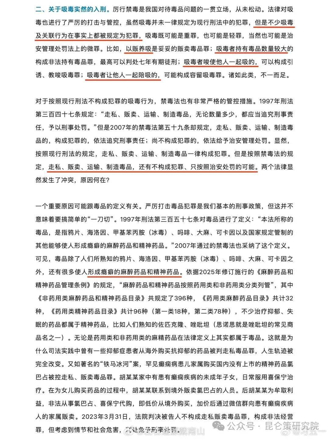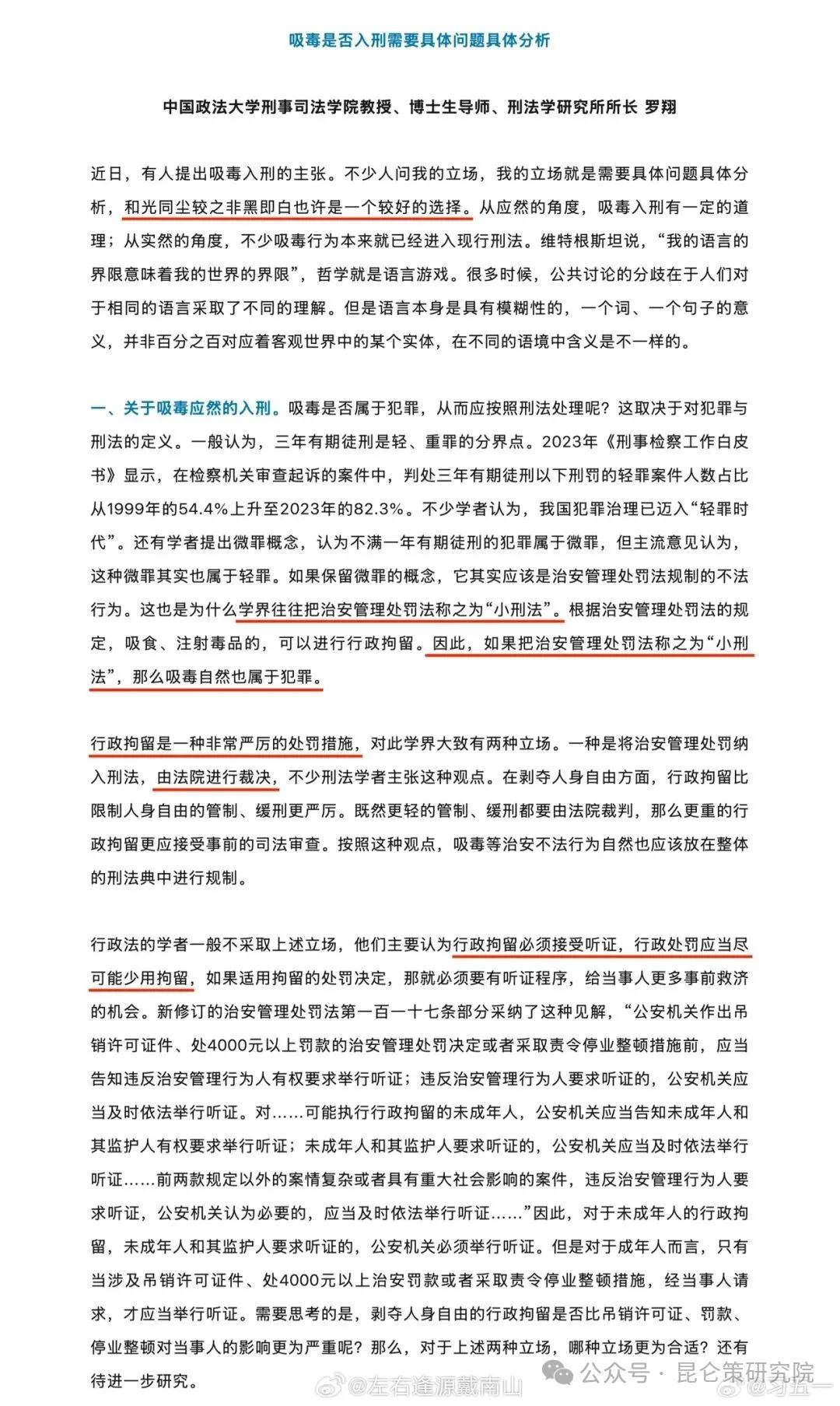罗翔文章的争议起点,在于对“吸毒入刑”概念的重构。他将《治安管理处罚法》称为“小刑法”,进而推导出“吸毒违反小刑法即属于小刑事犯罪”的结论,实质上混淆了行政处罚与刑事处罚的本质区别。在我国法律体系中,刑事犯罪的认定需严格遵循罪刑法定原则(《刑法》第三条),而吸毒行为在《治安管理处罚法》中明确界定为行政违法,其法律后果是行政拘留、罚款等行政处罚,而非有期徒刑等刑事制裁。这种概念偷换,本质上是通过学术话术模糊“入刑”的实质内涵,为“放宽涉毒行为刑责”铺路。