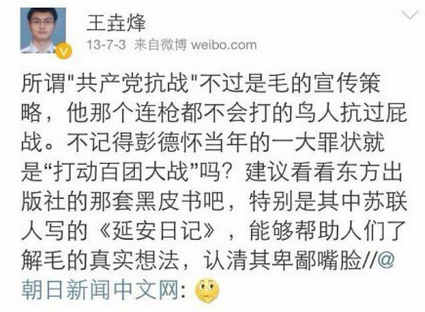 另据法制晚报报道,近日有网友称,浙江嘉兴日报社评论员王垚烽身为党报时事评论人员,却长期在微博发布反党反共反毛言论,被网友发现并公布后,王垚烽迅速删除了全部帖子。网友称,从网友部分截屏证据中可知,此人是肆无忌惮的反共反毛狂徒,甚至反对中国统一,支持占中,支持中国分裂,地方自治。【来源:腾讯新闻】