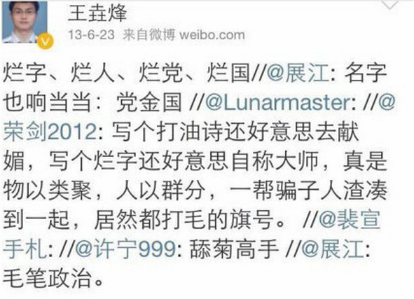 @张鹤慈 认为王垚烽的言论是对民主的糟蹋:“公知对民主的糟蹋比极左要命的多,如王垚烽这样充满仇恨的极右的发泄和煽动,对民主的毁坏比极左还凶。”