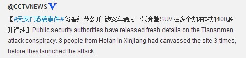 央视微博截图 央视微博截图 据央视消息,天安门恐袭案更多细节公布,一共8名恐怖分子,全部来自新疆和田,为此次袭击他们准备'...