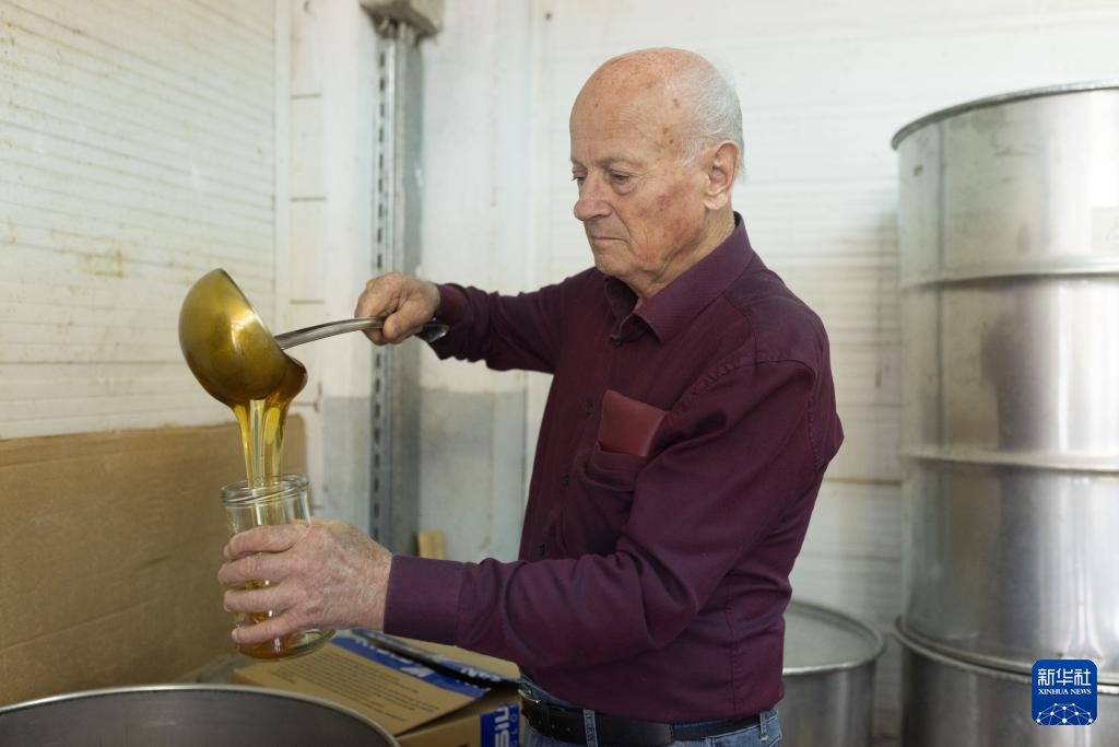 5月18日,在斯洛文尼亚波诺瓦·瓦斯村,养蜂人弗兰茨·斯库夫察将蜂蜜舀入瓶中。