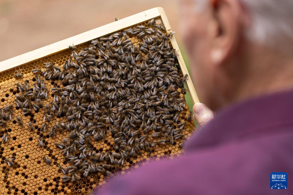 5月18日,斯洛文尼亚波诺瓦·瓦斯村,养蜂人弗兰茨·斯库夫察查看一板蜂房。