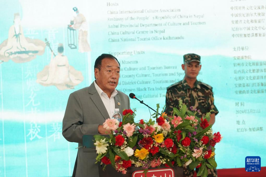 5月21日,尼泊尔文化、旅游和民航部部长塔芒在首都加德满都举行的“茶和天下·徽韵雅集”暨安徽文旅推介活动上致辞。