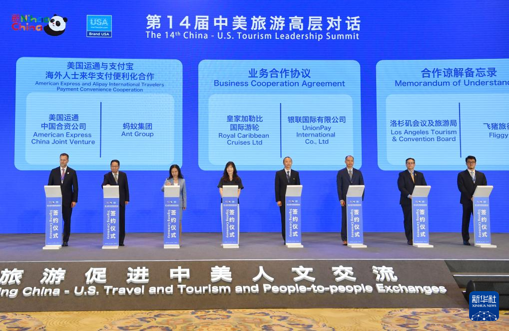这是5月22日在第14届中美旅游高层对话中拍摄的中美旅游伙伴城市签约仪式现场。