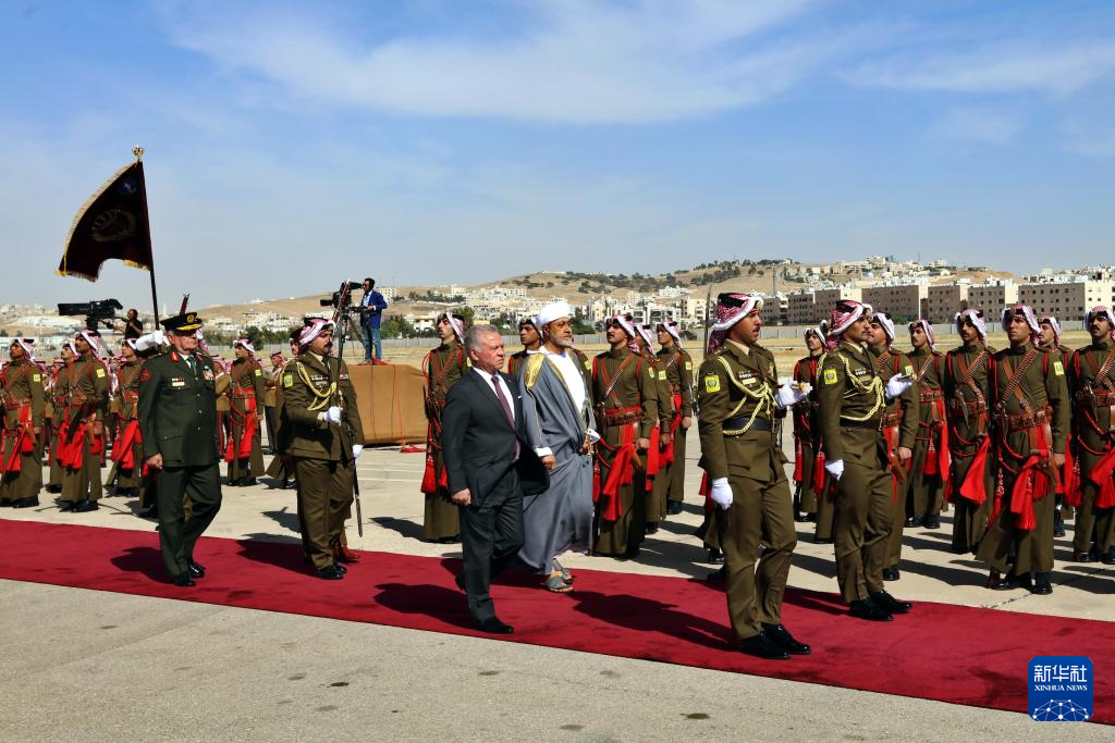 5月22日,在约旦安曼马尔卡机场,约旦国王阿卜杜拉二世(中左)为到访的阿曼苏丹海赛姆(中右)举行欢迎仪式。