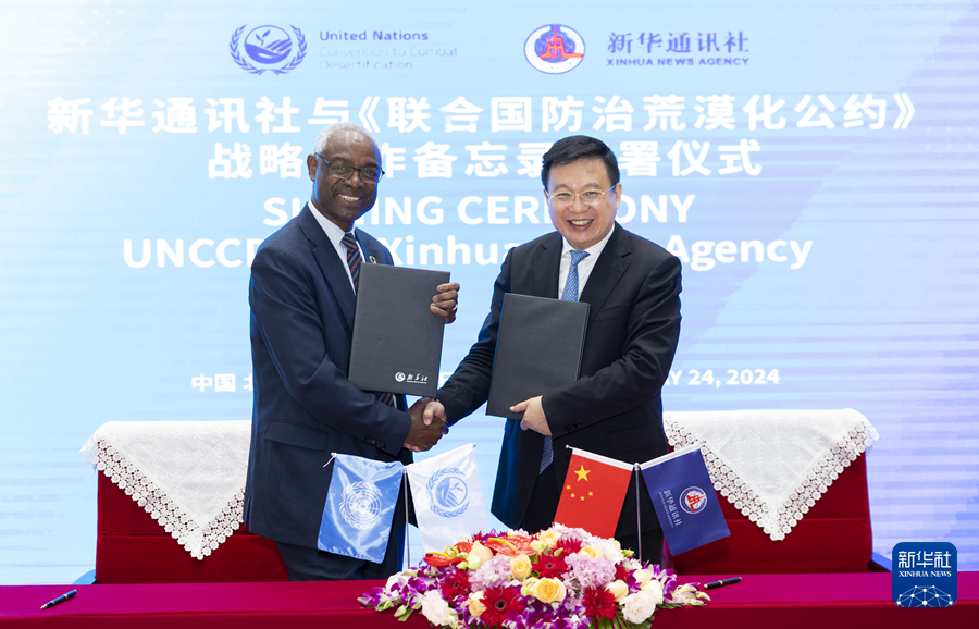 新华通讯社与《联合国防治荒漠化公约》战略合作备忘录在京签署-5月24日,新华通讯社社长傅华在北京会见来访的联合国副秘书长、《联合国防治荒漠化公约》'...