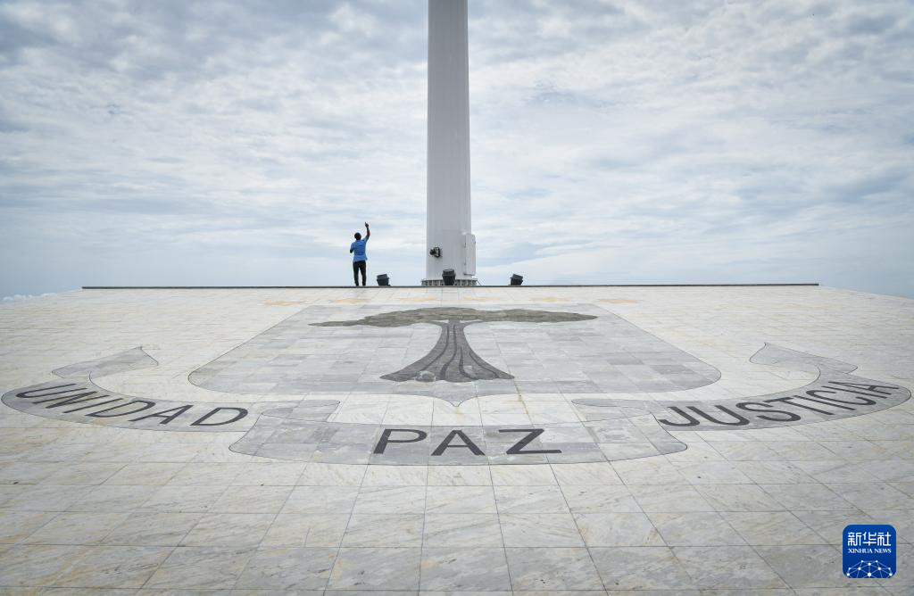 这是5月18日在赤道几内亚首都马拉博拍摄的赤道几内亚广场一隅,广场中央的旗杆底座镌刻有赤道几内亚国徽以及“团结、和平、正义”国家格言字样。