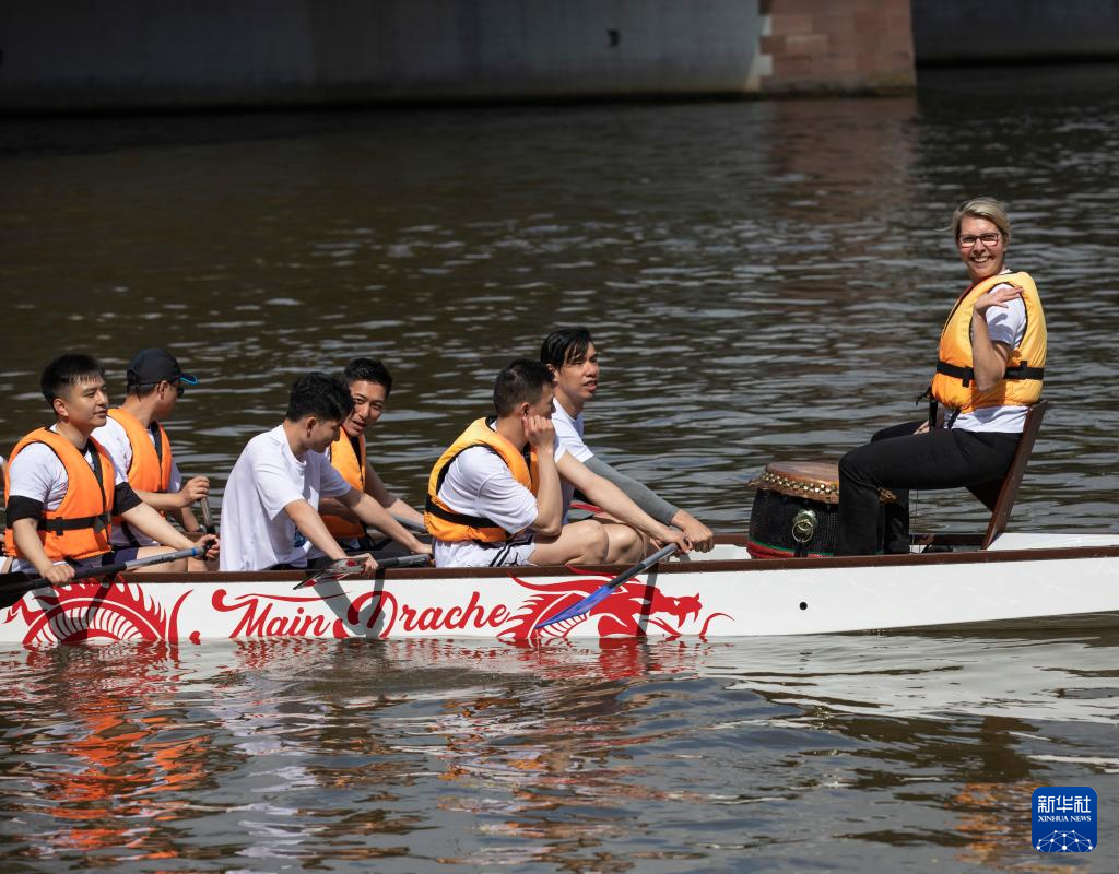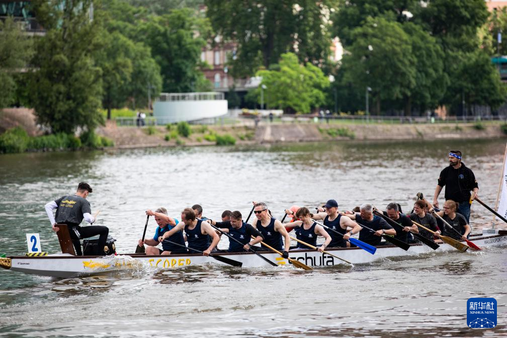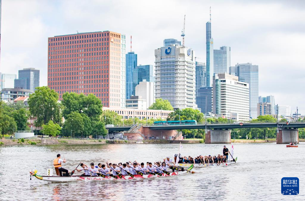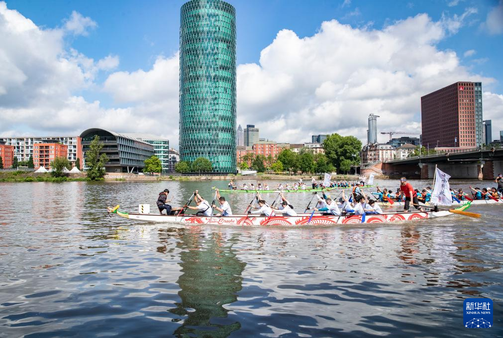 5月25日,在德国法兰克福,龙舟队伍在美因河上参加比赛。