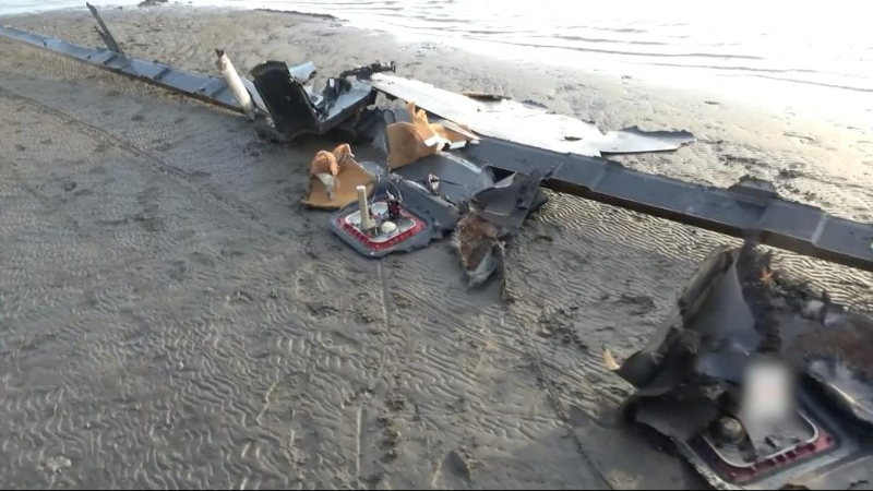 这张2月20日的视频截图显示,疑似被胡塞武装击落的美国MQ-9无人机残骸坠落到也门红海城市荷台达的一处海滩上。新华社发