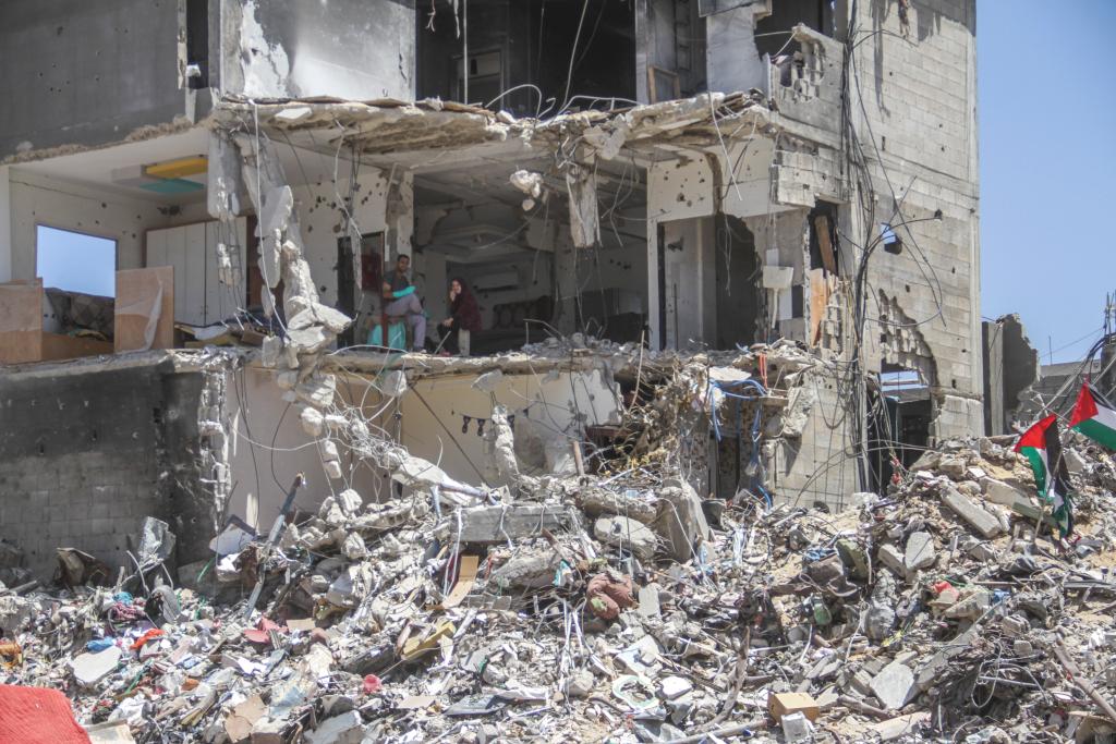 6月2日,在加沙地带北部杰巴利耶难民营,人们坐在一处被炸毁的房屋内。新华社发(马哈茂德·扎基摄)