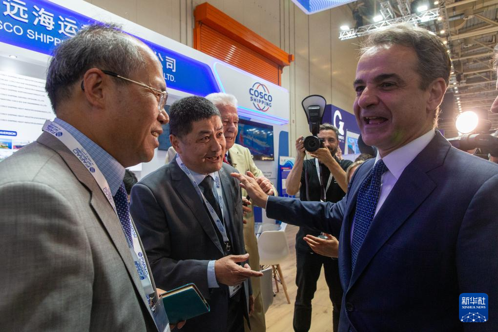 6月3日,希腊总理米佐塔基斯(右)在雅典举办的波塞冬国际海事展上参观中国企业展台。