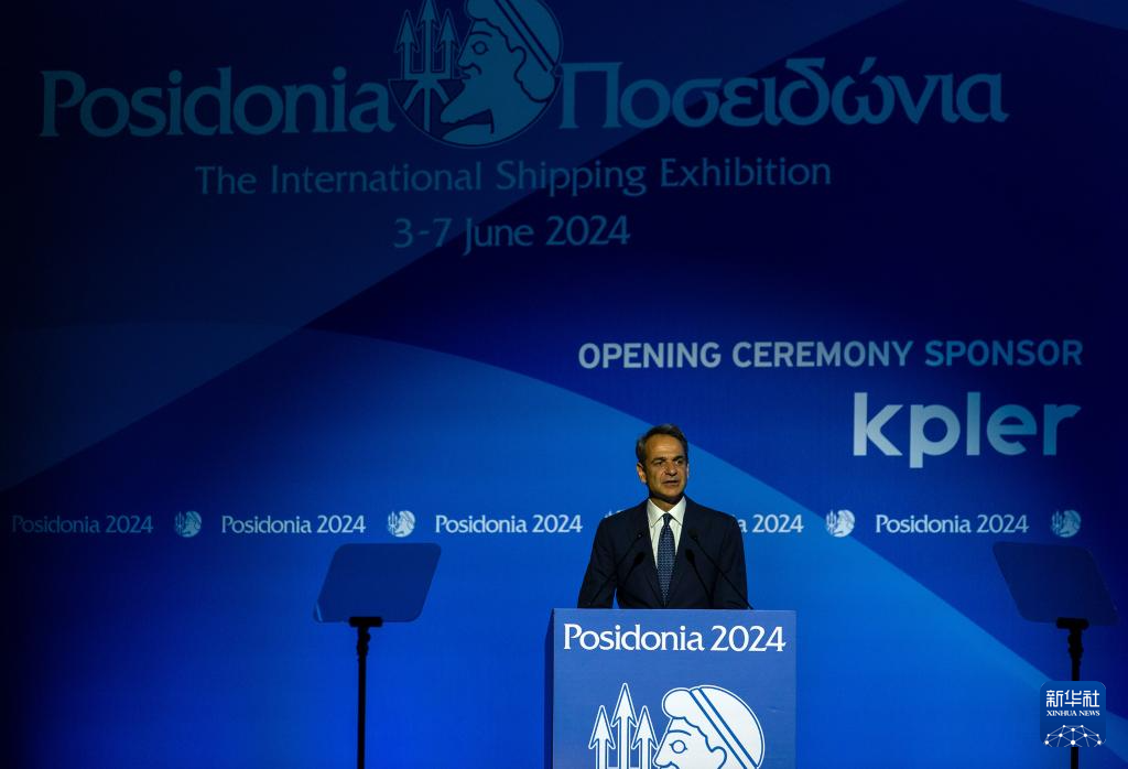 6月3日,希腊总理米佐塔基斯在雅典举办的波塞冬国际海事展开幕式上致辞。