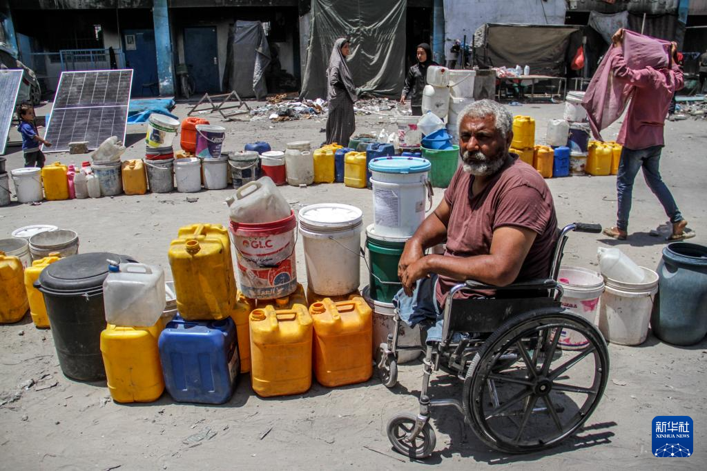 6月4日,在加沙地带北部杰巴利耶难民营,一名残疾人等待取水。