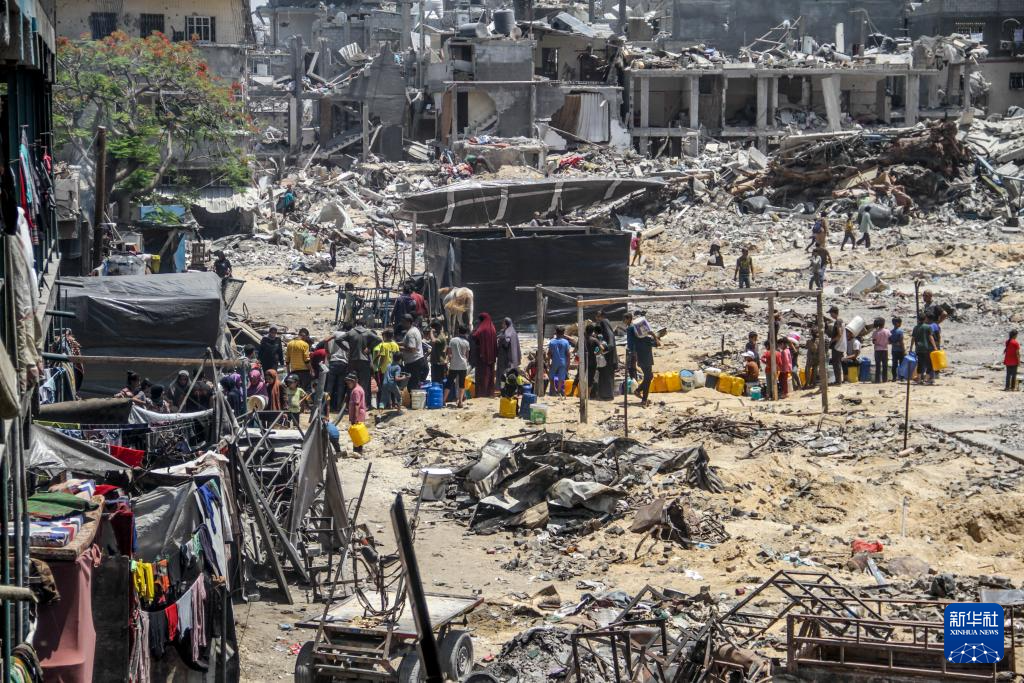 6月4日,在加沙地带北部杰巴利耶难民营,人们排队等待取水。