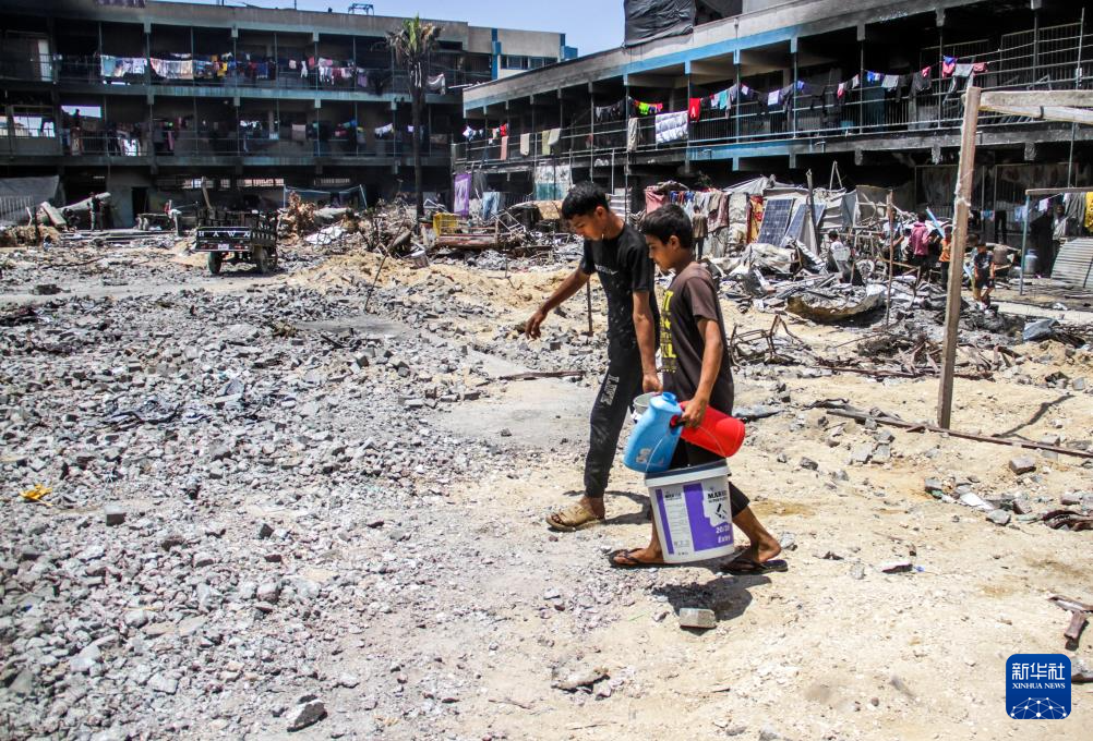 6月4日,在加沙地带北部杰巴利耶难民营,两名青少年用桶取水。