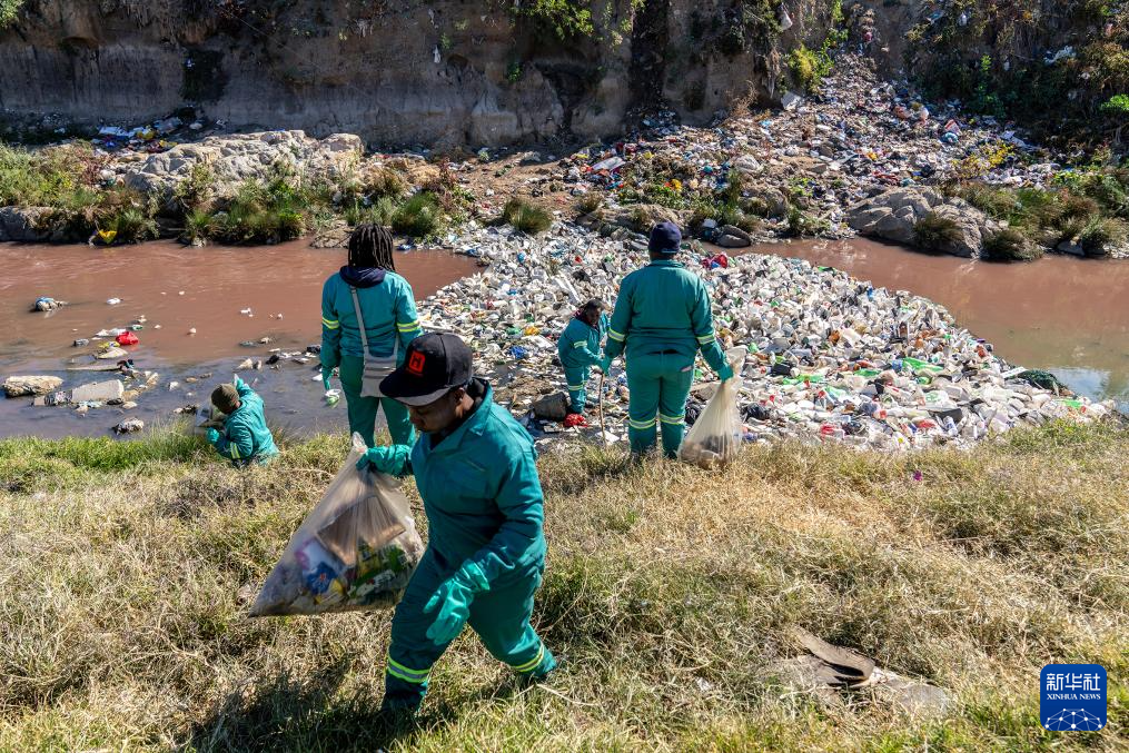 6月5日,工作人员在南非约翰内斯堡的一处河道清理垃圾。