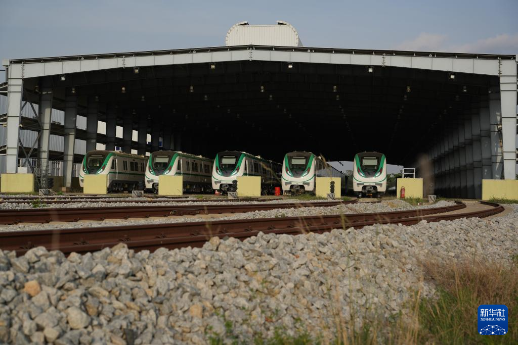 这是5月28日在尼日利亚阿布贾城铁一个车辆段拍摄的中国生产的动车组。新华社记者 杨喆 摄