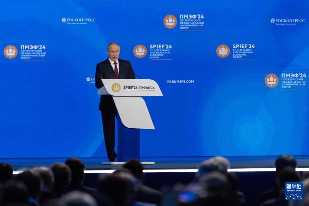 6月7日,俄罗斯总统普京在圣彼得堡国际经济论坛全体会议上讲话。