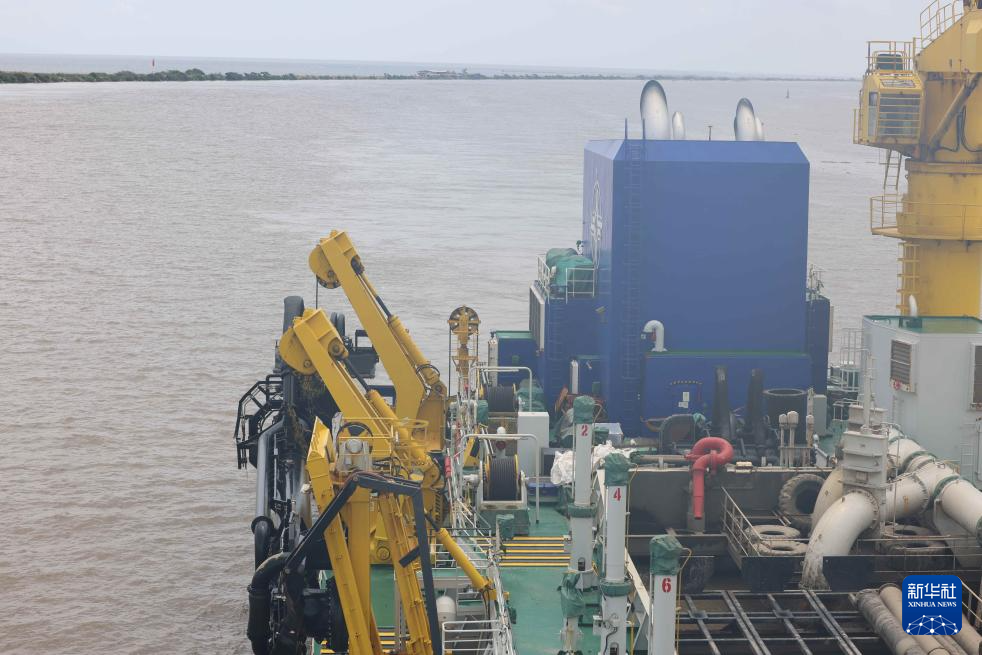 6月6日,在哥伦比亚巴兰基亚,中交上海航道局的“航浚6009”轮在马格达莱纳河入海处作业。
