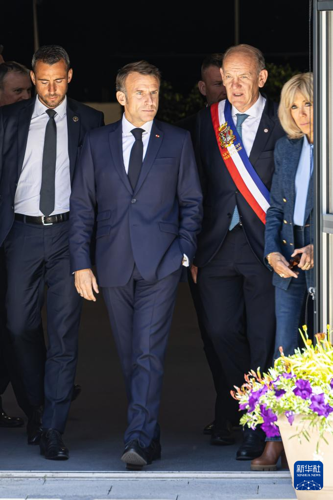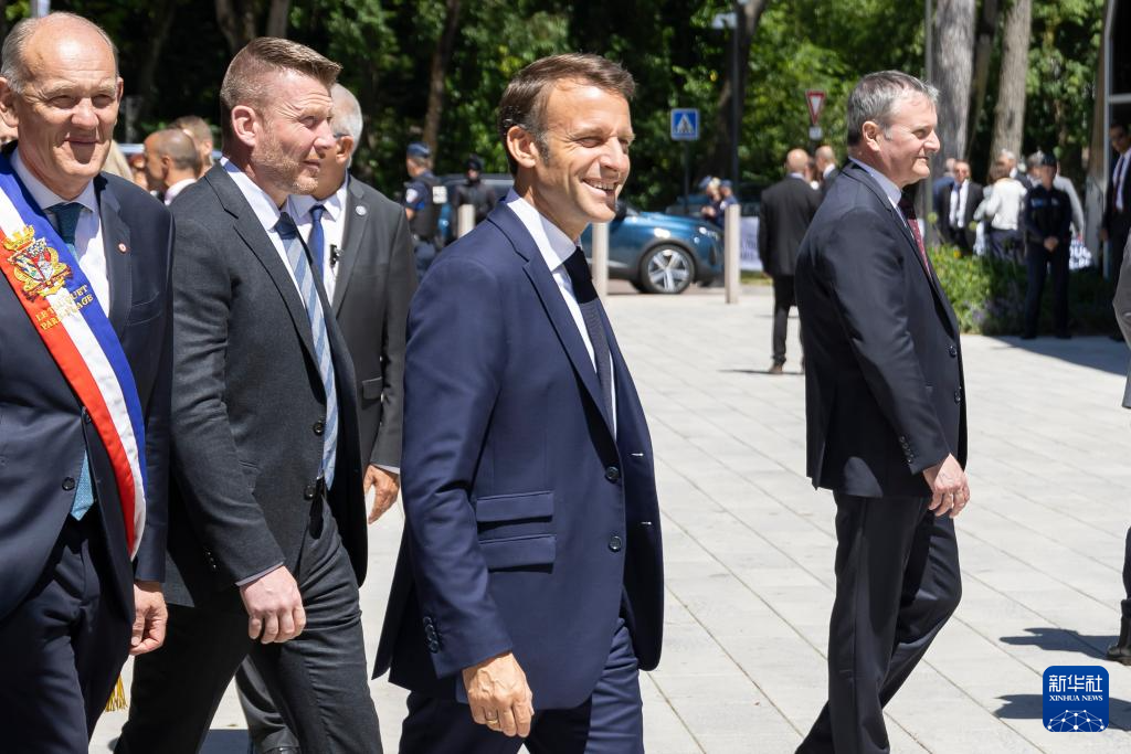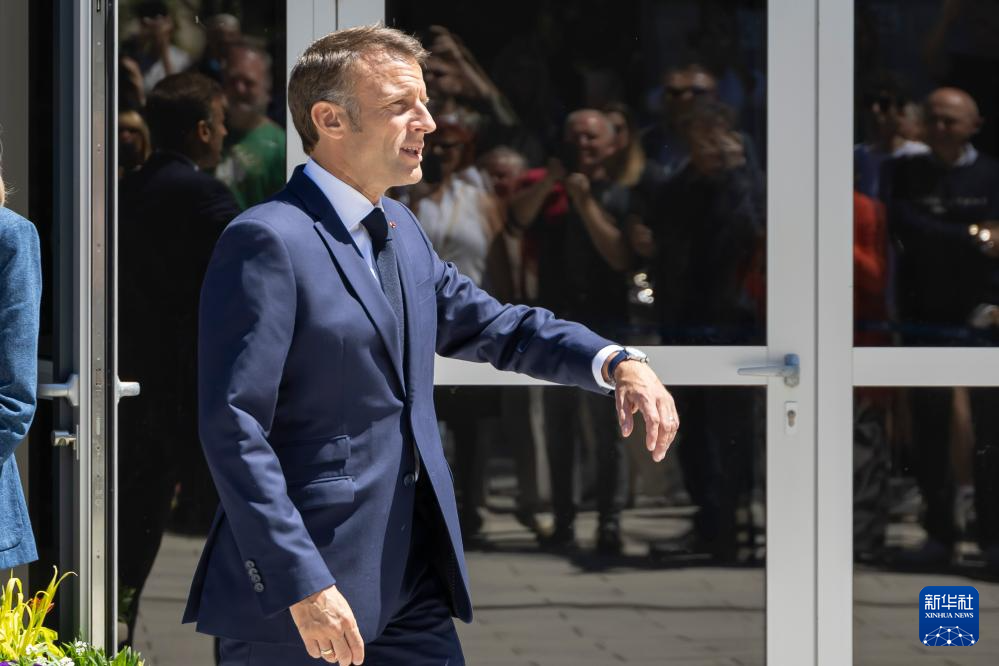 6月9日,在法国勒图凯市,法国总统马克龙(前左二)在参加欧洲议会选举投票后走出投票站。