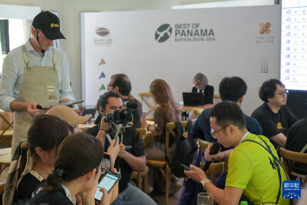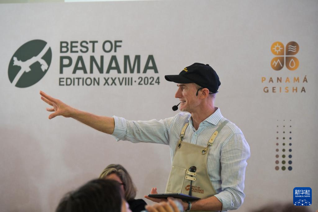 6月7日,在巴拿马西部城市博克特,主评委在第28届“巴拿马最佳”咖啡生豆大赛上宣布当天杯测结果。
